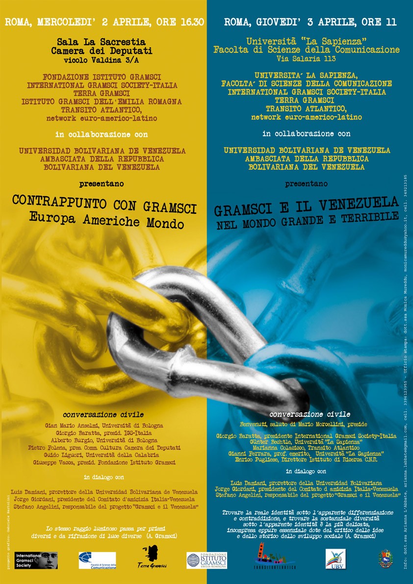 Si è svolta a Roma il 2 aprile 2008 una giornata di confronto sull’attualità del pensiero di Gramsci in Italia e Venezuela, primo di una serie di incontri analoghi in programma nei giorni successivi alla Sapienza di Roma, in Sardegna e a Napoli. L’iniziativa, promossa dalla International Gramsci Society-Italia (IGS-Italia), è stata sostenuta da Terra Gramsci, Transito Atlantico (rete interuniversitaria euro-americo-latina), Fondazione Istituto Gramsci (FIS) e Istituto Gramsci dell’Emilia Romagna, in collaborazione con Universidad Bolivariana de Venezuela e Ambasciata della Repubblica Bolivariana del Venezuela.